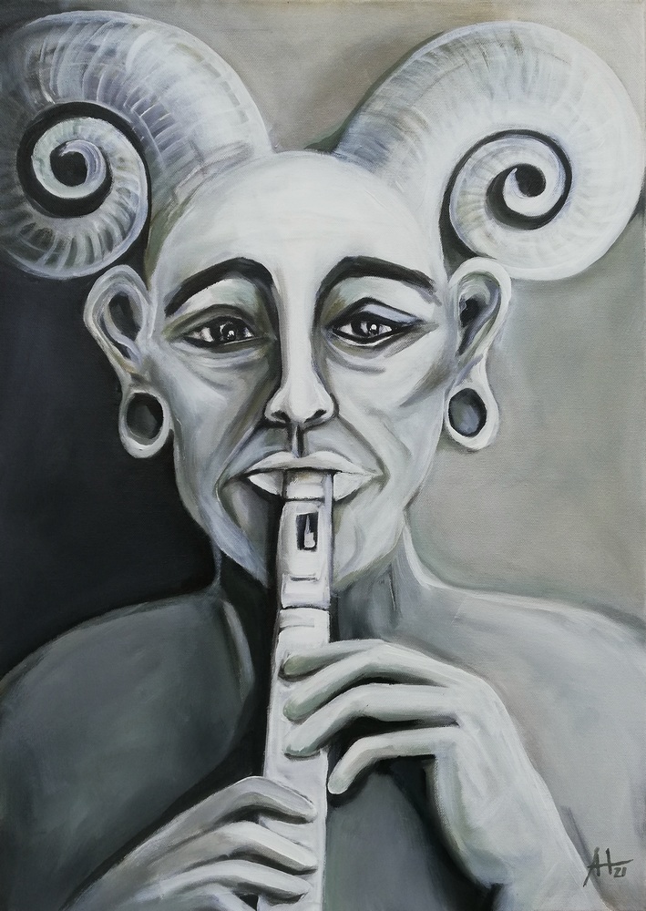 Farbreduziert – ich verwendete lediglich die drei Farbtöne Umbra, Weiß und Schwarz – stelle ich hier einen flötenden Faun dar. Ein freundlicher und sehr feinfühliger Gott der Hirten, Bauern und Wälder.