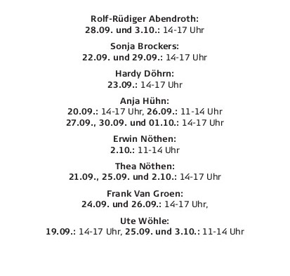 Die beteiligten acht KünstlerInnen sind zu folgenden Zeiten persönlich in der Ausstellung anzutreffen:
