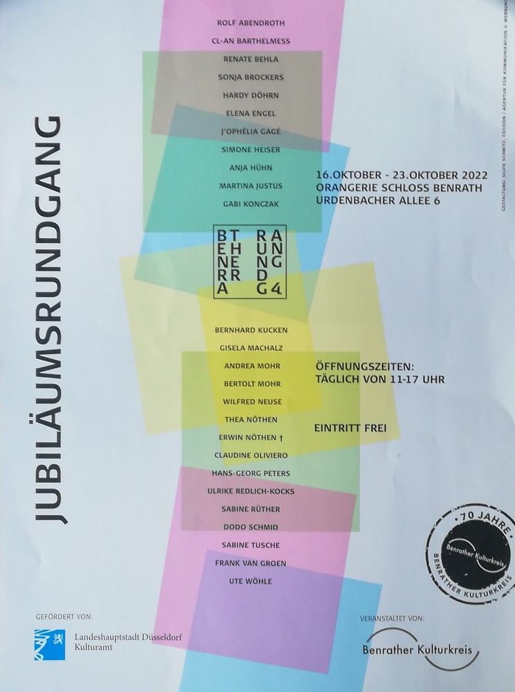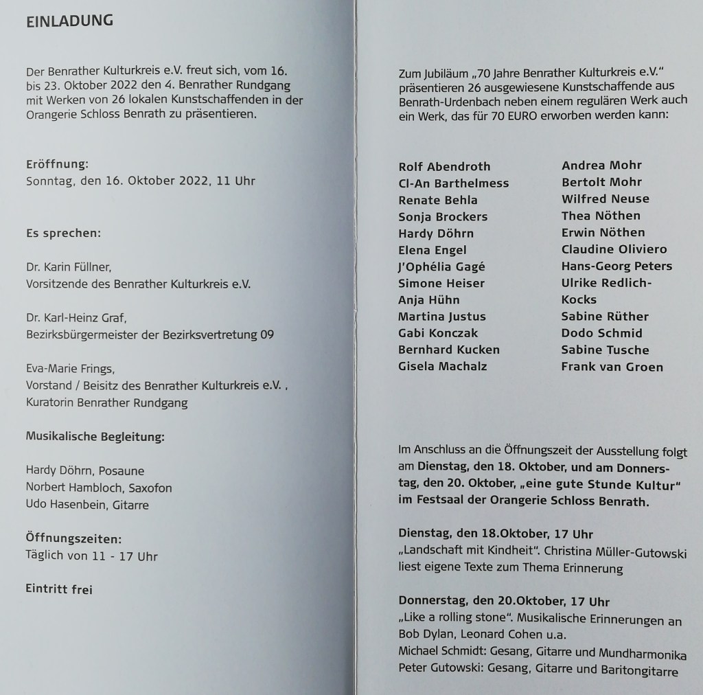 Der Jubiläumsrundgang mit 26 Künstlerinnen und Künstlern aus dem Düsseldorfer Süden wird am Sonntag, dem 16. Oktober 2022, um 11.00 Uhr in der Orangerie Schloss Benrath eröffnet.